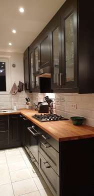 Este apartamento tem uma cozinha com azuleijo no piso e todo o equipamento pela sua vida quotidiana : fogaõ, frigorífico, forno, microondas, torradeira, prateleira, armário, loiça.