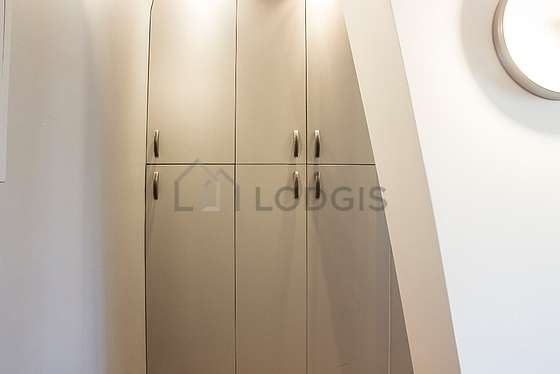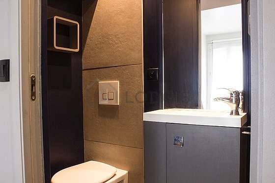 Este apartamento é equipado de uma casa de banho agradável é clara. Esta sala de água dispõe do necessário pelo seu bem estar na sua vida quotidiana : toalhas de banho, armário, ducheiro separado, sink, mirror, radiator secador de toalhas, carpet. Os WC são integrados na casa de banho.