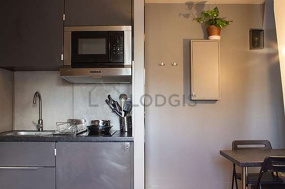 Este apartamento tem uma bonita cozinha com parqué no piso e todo o equipamento pela sua vida quotidiana : fogaõ, frigorífico, microondas, freezer, exaustur, armário, loiça.