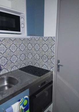 Este apartamento tem uma magnífico cozinha com parqué no piso e todo o equipamento pela sua vida quotidiana : fogaõ, frigorífico, forno, microondas, torradeira, máquina de café, prateleira.