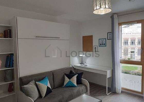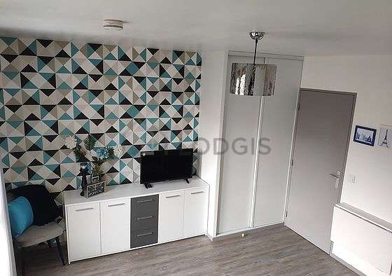 SalaõEste apartamento é composto de um bonito salão com parqué no piso é janelas. Este salão calmo mobiliado et equipado para uma agradável estância : televisaõ, lençois, colchas, sofá, mesa de jantar, mesinha, secretária, roupeiro, prateleira, armário, 2 cadeira(s)1 cama embutida no muro.