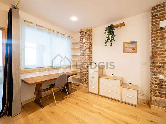 Com parqué no piso este quarto atraente oferece o equipamento necessário para descansar durante sua estância : colchas, secretária, prateleira, armário, 1 cadeira(s)1 cama embutida.