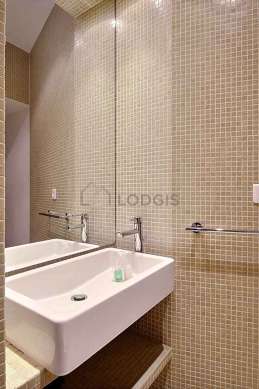 Este apartamento é equipado de uma casa de banho magnífico. Esta sala de água dispõe do necessário pelo seu bem estar na sua vida quotidiana : toalhas de banho, prateleira, sink. Os WC são integrados na casa de banho.