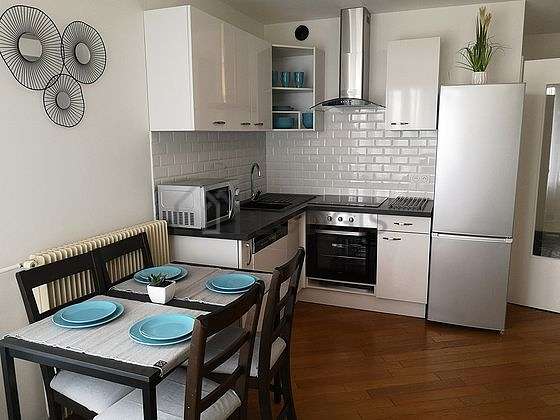 Este apartamento tem uma magnífico cozinha com parqué no piso e todo o equipamento pela sua vida quotidiana : fogaõ, frigorífico, congelador, forno, microondas, mesa de jantar, guarda-roupa, loiça, 1 cadeira(s).