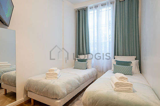 Com parqué no piso este quarto agradável oferece o equipamento necessário para descansar durante sua estância : televisaõ, lençois, colchas, roupeiro, prateleira, armário2 cama.