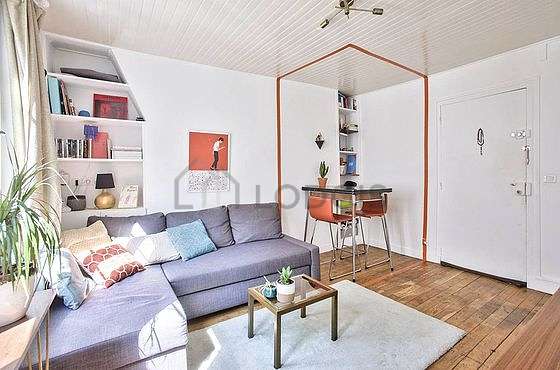 SalaõEste apartamento é composto de um salão com parqué no piso. Este salão mobiliado et equipado para uma agradável estância : televisaõ, sofá, mesinha, prateleira, 1 cadeira(s), bar.