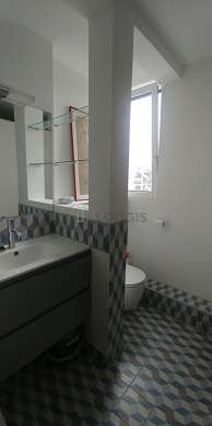 Este apartamento é equipado de uma casa de banho. Esta sala de água dispõe do necessário pelo seu bem estar na sua vida quotidiana : toalhas de banho, prateleira, ducheiro separado, secador, airer, sink, mirror, towel rack, radiator secador de toalhas, ventilator. Os WC são integrados na casa de banho.