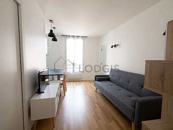 SalaõEste apartamento é composto de um soberbo salão com parqué no piso é janelas. Este salão very quiet mobiliado et equipado para uma agradável estância : televisaõ, sofá, mesinha, biblioteca.