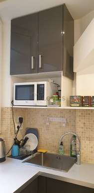 Este apartamento tem uma bonita cozinha com azuleijo no piso e todo o equipamento pela sua vida quotidiana : fogaõ, frigorífico, micro-ondas combinado, freezer, chaleira, armário.