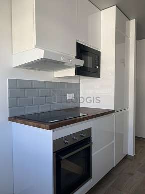 Este apartamento tem uma cozinha e todo o equipamento pela sua vida quotidiana : fogaõ, frigorífico, congelador, forno, microondas, armário, loiça.