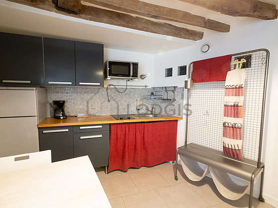 Este apartamento tem uma magnífico cozinha com azuleijo no piso e todo o equipamento pela sua vida quotidiana : fogaõ, frigorífico, congelador, micro-ondas combinado, freezer, máquina de café, mesa de jantar, prateleira, armário, loiça, 1 cadeira(s).