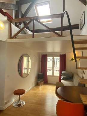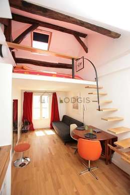 Graças a sua altura de teto, um mezanino foi possível de ser instalado em este apartamento , oferecendo-lhe uma verdadeira peça suplementar equipada de lençois, colchas, prateleira, armário, viga, floor lamp, painting.