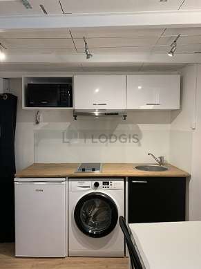 Este apartamento tem uma magnífico cozinha com azuleijo no piso e todo o equipamento pela sua vida quotidiana : fogaõ, frigorífico, microondas, freezer, exaustur, torradeira, máquina de café, armário, loiça.