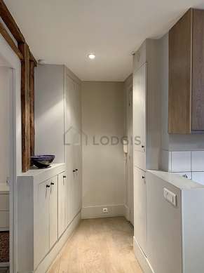 Este apartamento tem uma magnífico cozinha com parqué no piso e todo o equipamento pela sua vida quotidiana : fogaõ, frigorífico, congelador, micro-ondas combinado, exaustur, máquina de café, prateleira, guarda-roupa, armário, loiça, bar, bin.