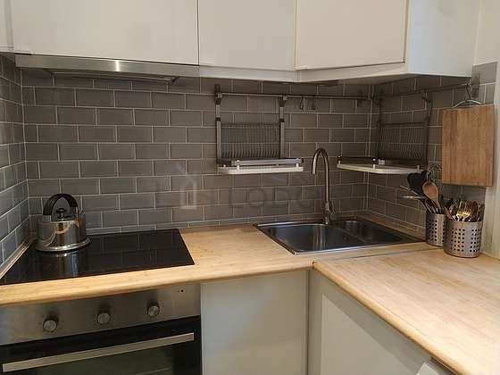 Este apartamento tem uma magnífico cozinha com parqué no piso e todo o equipamento pela sua vida quotidiana : fogaõ, frigorífico, congelador, forno, exaustur, torradeira, chaleira, máquina de café, armário, loiça.