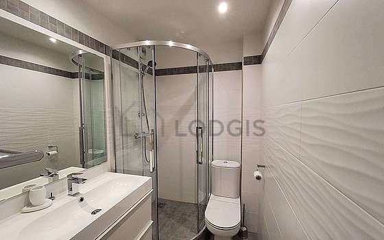 Este apartamento é equipado de uma casa de banho magnífico. Esta sala de água dispõe do necessário pelo seu bem estar na sua vida quotidiana : comoda, ducheiro separado, sink, mirror, towel rack, bin, radiator secador de toalhas, ventilator. Os WC são integrados na casa de banho.