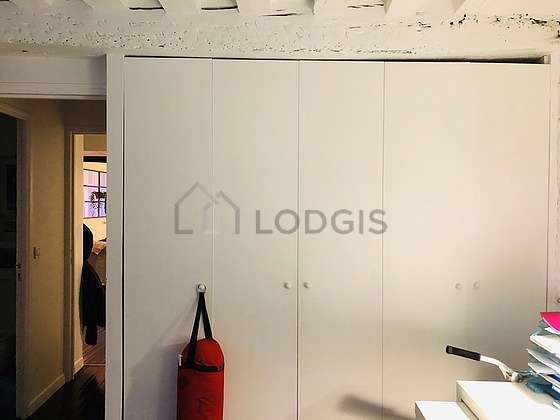 SalaõEste apartamento é composto de um soberbo salão com parqué no piso vista sobre rua. Este salão calmo mobiliado et equipado para uma agradável estância : televisaõ, frigorífico, sofá, 1 poltrona(s), mesa de jantar, biblioteca, prateleira, guarda-roupa, armário, viga, 1 cadeira(s), banco, bar, tv stand, mirror, coat stand, bin, carpet, vase.