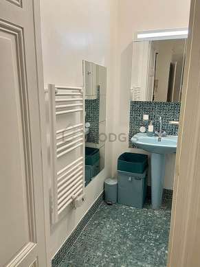 Este apartamento é equipado de uma casa de banho agradável é clara. Esta sala de água dispõe do necessário pelo seu bem estar na sua vida quotidiana : toalhas de banho, guarda-roupa, banheira, airer, sink, mirror, bin, radiator secador de toalhas, carpet. Os WC são integrados na casa de banho.