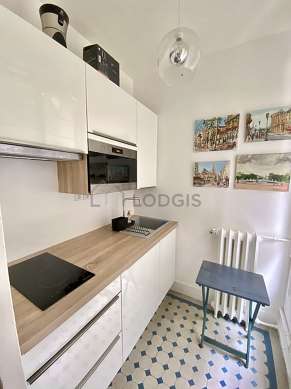 Este apartamento tem uma magnífico cozinha com azuleijo no piso e todo o equipamento pela sua vida quotidiana : fogaõ, frigorífico, congelador, microondas, exaustur, prateleira, armário, loiça.