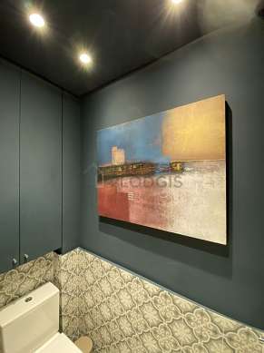 Este apartamento é equipado de uma casa de banho magnífico é clara. Esta sala de água dispõe do necessário pelo seu bem estar na sua vida quotidiana : toalhas de banho, prateleira, comoda, ducheiro separado, secador, sink, radiator secador de toalhas. Os WC são integrados na casa de banho.