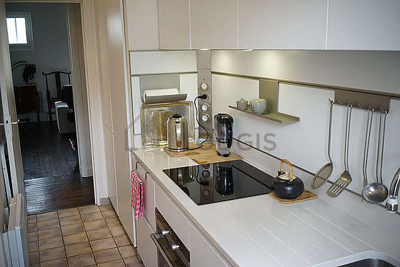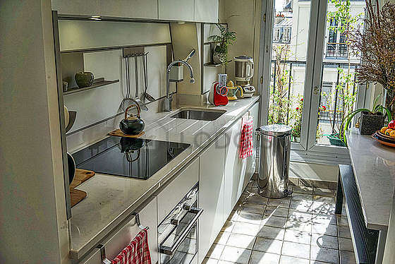 Este apartamento tem uma magnífico cozinha com azuleijo no piso e todo o equipamento pela sua vida quotidiana : fogaõ, frigorífico, forno, freezer, torradeira, chaleira, máquina de café, mesa de jantar, prateleira, guarda-roupa, armário, loiça, electrodomésticos, 1 cadeira(s), banco, bin, vase.