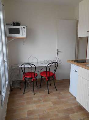 Este apartamento tem uma bonita cozinha com parqué no piso e todo o equipamento pela sua vida quotidiana : fogaõ, frigorífico, micro-ondas combinado, máquina de café, mesa de jantar, prateleira, armário, loiça, 1 cadeira(s), bin.