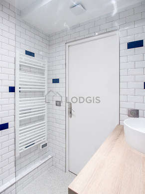 Este apartamento é equipado de uma casa de banho magnífico. Esta sala de água dispõe do necessário pelo seu bem estar na sua vida quotidiana : prateleira, ducheiro separado, sink, radiator secador de toalhas. Os WC são separados da casa de banho e situados em uma peça independente.