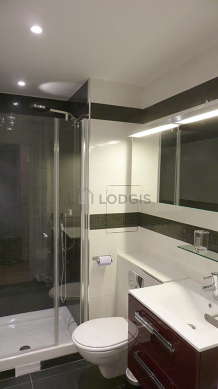 Este apartamento é equipado de uma casa de banho magnífico é muito clara. Esta sala de água dispõe do necessário pelo seu bem estar na sua vida quotidiana : toalhas de banho, guarda-roupa, ducheiro separado, sink, mirror, radiator secador de toalhas, ventilator. Os WC são integrados na casa de banho.