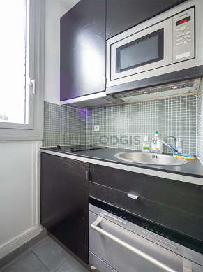 Este apartamento tem uma bonita cozinha com azuleijo no piso e todo o equipamento pela sua vida quotidiana : fogaõ, frigorífico, micro-ondas combinado, freezer, exaustur, máquina de café, armário, loiça.
