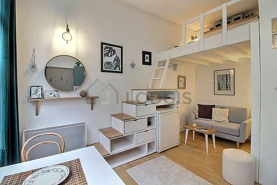Graças a sua altura de teto, um mezanino foi possível de ser instalado em este apartamento , oferecendo-lhe uma verdadeira peça suplementar equipada de lençois, colchas, prateleira, armário.