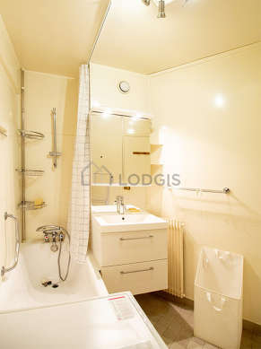 Este apartamento é equipado de uma casa de banho agradável. Esta sala de água dispõe do necessário pelo seu bem estar na sua vida quotidiana : toalhas de banho, prateleira, armário, banheira, airer, sink, towel rack. Os WC são separados da casa de banho e situados em uma peça independente.