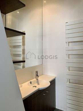 Este apartamento é equipado de uma casa de banho magnífico. Esta sala de água dispõe do necessário pelo seu bem estar na sua vida quotidiana : prateleira, armário, ducheiro separado, sink, mirror, radiator secador de toalhas. Os WC são separados da casa de banho e situados em uma peça independente.