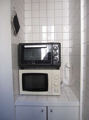Este apartamento tem uma cozinha com azuleijo no piso e todo o equipamento pela sua vida quotidiana : fogaõ, frigorífico, forno, microondas, freezer, torradeira, chaleira, máquina de café, armário, loiça.