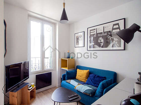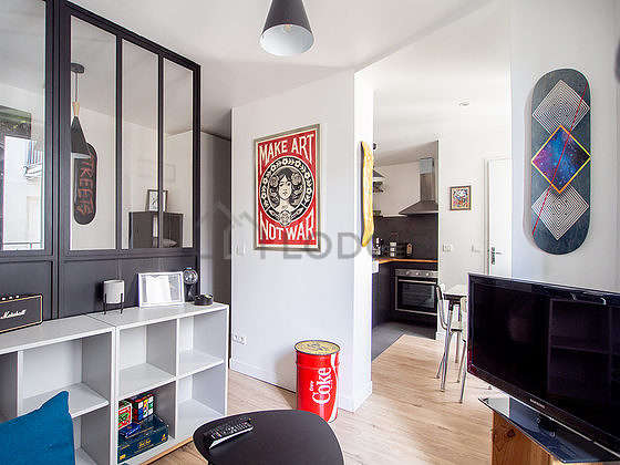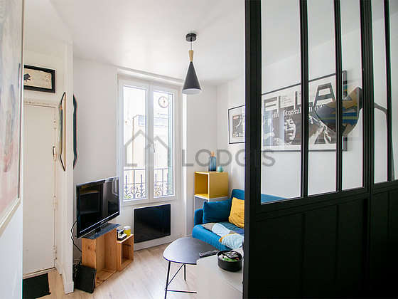 Este apartamento é composto de um bonito salão com parqué no piso vista sobre pátio. Este salão very quiet mobiliado et equipado para uma agradável estância : televisaõ, sofá, mesinha, biblioteca, prateleira, floor lamp, chandelier, tv stand, painting, vase.