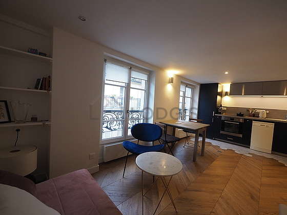 SalaõEste apartamento é composto de um bonito salão com parqué no piso é janelas. Este salão very quiet mobiliado et equipado para uma agradável estância : sofá, mesa de jantar, 1 cadeira(s).