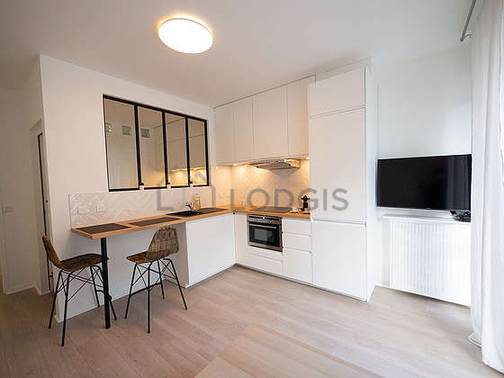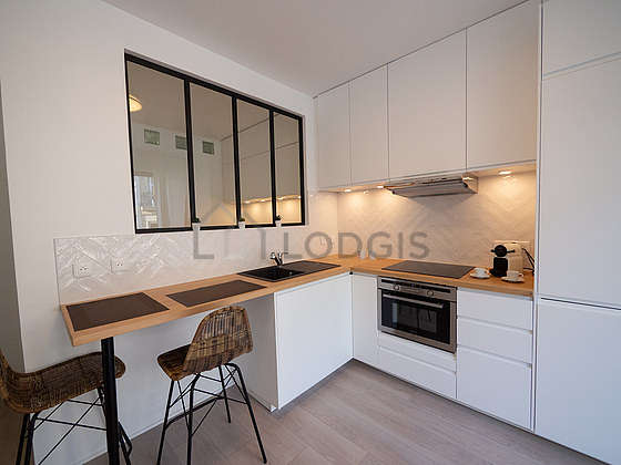 Este apartamento tem uma magnífico cozinha com parqué no piso e todo o equipamento pela sua vida quotidiana : congelador, torradeira, máquina de café.