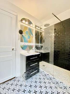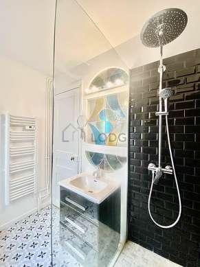 Este apartamento é equipado de uma casa de banho magnífico é muito clara. Esta sala de água dispõe do necessário pelo seu bem estar na sua vida quotidiana : toalhas de banho, comoda, ducheiro separado, sink, sink, radiator secador de toalhas. Os WC são integrados na casa de banho.