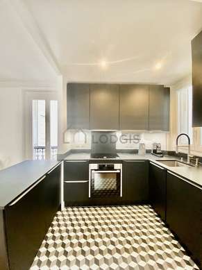 Este apartamento tem uma magnífico cozinha com parqué no piso e todo o equipamento pela sua vida quotidiana : fogaõ, frigorífico, congelador, forno, freezer, torradeira, mesa de jantar, prateleira, guarda-roupa, loiça, 1 cadeira(s).
