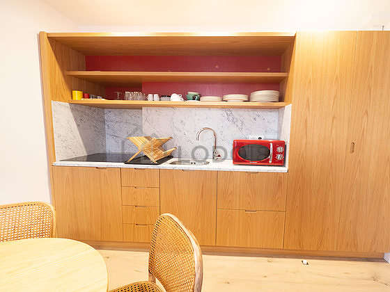 Este apartamento tem uma magnífico cozinha com parqué no piso e todo o equipamento pela sua vida quotidiana : fogaõ, frigorífico, microondas, mesa de jantar, armário, loiça, 1 cadeira(s).