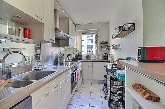 Este apartamento tem uma magnífico cozinha com azuleijo no piso e todo o equipamento pela sua vida quotidiana : fogaõ, frigorífico, forno, exaustur, torradeira, chaleira, máquina de café, armário, loiça.