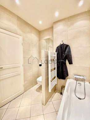 Este apartamento é equipado de uma casa de banho. Esta sala de água dispõe do necessário pelo seu bem estar na sua vida quotidiana. Os WC são separados da casa de banho e situados em uma peça independente.
