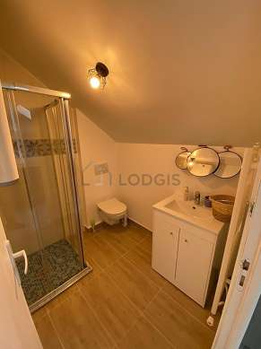 Este apartamento é equipado de uma casa de banho magnífico é muito clara. Esta sala de água dispõe do necessário pelo seu bem estar na sua vida quotidiana : toalhas de banho, prateleira, armário, ducheiro separado, sink, sink, mirror, towel rack, bin, ventilator. Os WC são integrados na casa de banho.