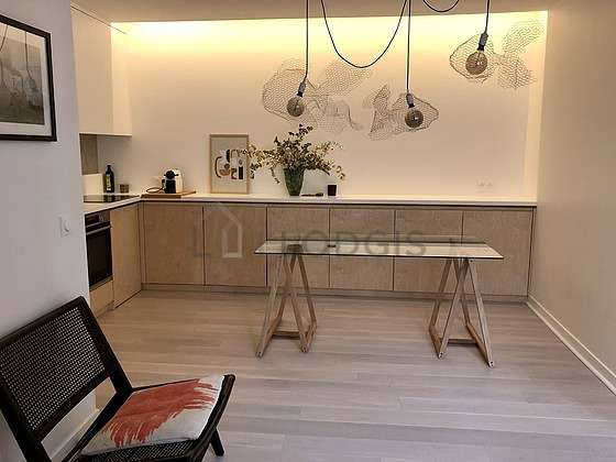 Este apartamento tem uma bonita cozinha com linoleo no piso e todo o equipamento pela sua vida quotidiana : frigorífico, congelador, forno, chaleira, máquina de café, mesa de jantar, 4 cadeira(s), soup plates, dessert plates, plates, bowl, casserole dish, cooking knives, bread knife, lid, cutlery, wooden spoon, hot plate, drying up stand, whisk, lamp, cake tin, chopping board, work surface, baking dish, service dish, teatray, stove, salad mixer, coffee cups, tea pot, water glass, wine glass.