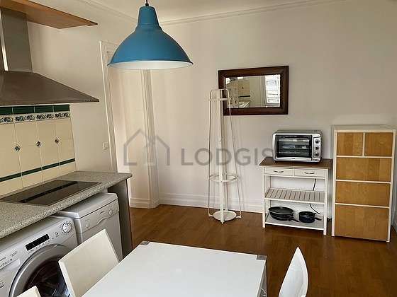 Este apartamento tem uma bonita cozinha com parqué no piso e todo o equipamento pela sua vida quotidiana : fogaõ, frigorífico, congelador, forno, microondas, mesa de jantar, loiça, 1 cadeira(s).