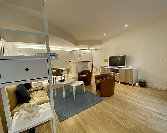 Este apartamento é composto de um bonito salão com parqué no piso vista sobre pátio. Este salão very quiet mobiliado et equipado para uma agradável estância : televisaõ, colchas, sofá, 1 poltrona(s), mesa de jantar, mesinha, prateleira, armário, 1 cadeira(s), floor lamp, lamp, tv stand, mirror, ceiling light, painting, carpet1 sofá-cama.