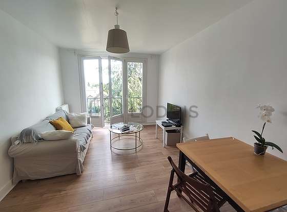 SalaõEste apartamento é composto de um bonito salão com parqué no piso é janelas. Este salão very quiet mobiliado et equipado para uma agradável estância : televisaõ, sofá, mesa de jantar, mesinha, 4 cadeira(s), lamp, tv stand, mirror1 sofá-cama.