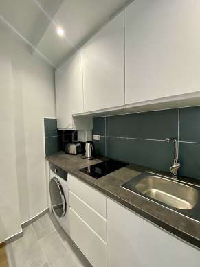 Este apartamento tem uma magnífico cozinha com azuleijo no piso e todo o equipamento pela sua vida quotidiana : fogaõ, frigorífico, micro-ondas combinado, exaustur, torradeira, chaleira, máquina de café, mesa de jantar, armário, loiça, 1 cadeira(s).