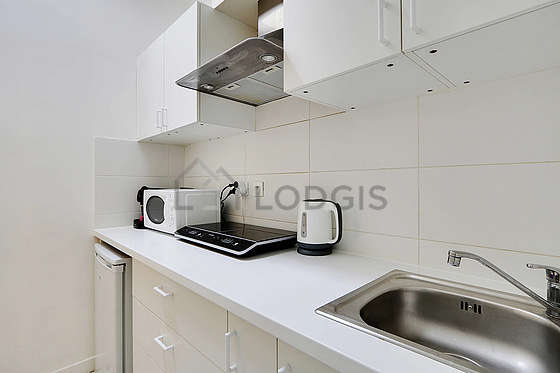 Este apartamento tem uma cozinha e todo o equipamento pela sua vida quotidiana : fogaõ, frigorífico, microondas, torradeira, chaleira, máquina de café.