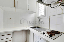 Este apartamento tem uma cozinha e todo o equipamento pela sua vida quotidiana : fogaõ, frigorífico, torradeira, chaleira, máquina de café.