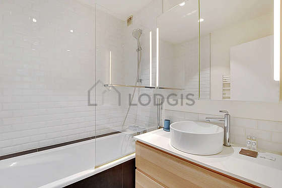 Este apartamento é equipado de uma casa de banho magnífico é muito clara. Esta sala de água dispõe do necessário pelo seu bem estar na sua vida quotidiana : toalhas de banho, armário, banheira, secador, sink, mirror, radiator secador de toalhas. Os WC são separados da casa de banho e situados em uma peça independente.
